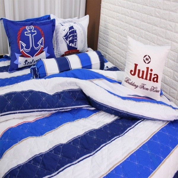Bộ chăn, drap, gối Julia gồm 5 món: một drap bọc chần thun, bọc được nệm cao từ 5 cm đến 25 cm; hai áo gối nằm 50 cm x 70 cm; một áo gối ôm 37 cm x 105 cm; một vỏ chăn hai lớp, có dây kéo, kích thước 2 m x 2,2 m. Vẫn là chất liệu cotton sợi bông nhập khẩu Hàn Quốc, bộ chăn, drap có bề mặt mềm mại, thấm hút tốt và thoáng khí, thích hợp sử dụng những ngày hè nóng bức, không gây cảm giác ngứa ngáy hay kích ứng da.